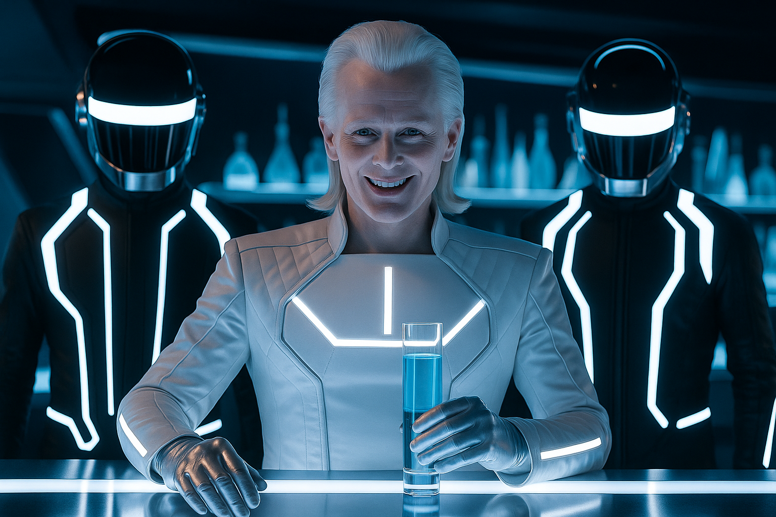 Allí, las bebidas de datos líquidos fluyen en vasos de luz, servidas por bartenders que parecen extensiones del propio código fuente. Los DJs —Daft Punk— generan ondas sonoras que se transforman en energía, uniendo cuerpos y bits en un mismo compás.